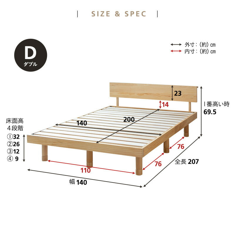 | サイズ | ダブルサイズ 全体(ヘッドボード含む):約幅140×奥行207×高さ46.5-69.5cm 床面:約幅140×奥行200×高さ9-32cm(4段階調節) |