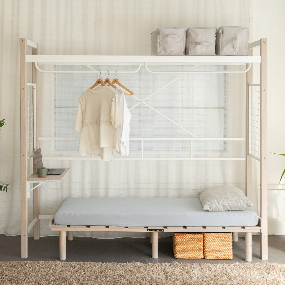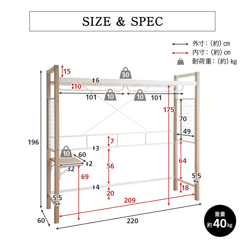 | 耐荷重 | 天井ラック:約30kg デスク天板:約10kg ハンガーパイプ(1本あたり):約10kg ベッドフレーム:約200kg |