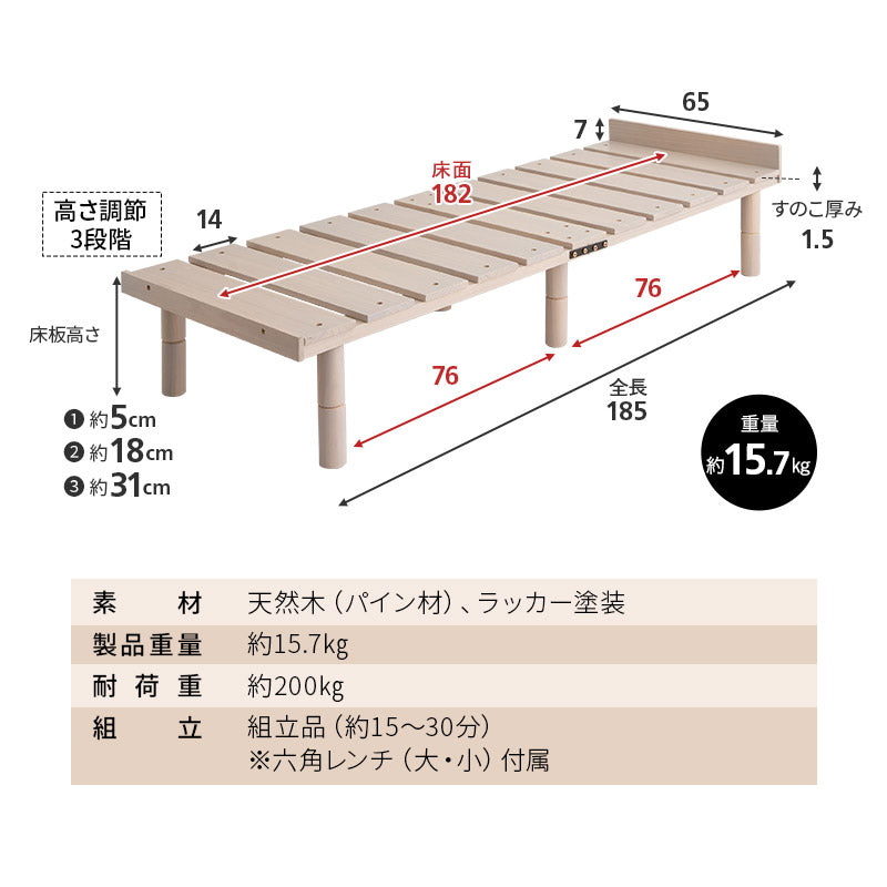 ベッドフレームは天然パイン無垢材と通気性に優れる構造で頑丈な耐荷重約200kgを実現しています。