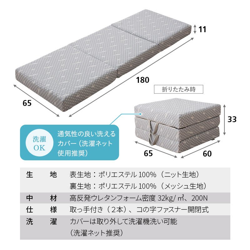 ■サイズ Lサイズ:約幅65×奥行180×厚さ11cm (折りたたみ時:約幅65×奥行60×高さ33cm) ■組成 表生地:ポリエステル100%(ニット生地) 裏生地:ポリエステル100%(メッシュ生地) 中材:高反発ウレタンフォーム 密度32kg/m³ 200N ■製品重量 約5kg ■お手入れ方法 カバーを取り外して洗濯機洗い可能 ※洗濯ネット使用推奨 ※ウレタンは洗えません。 |