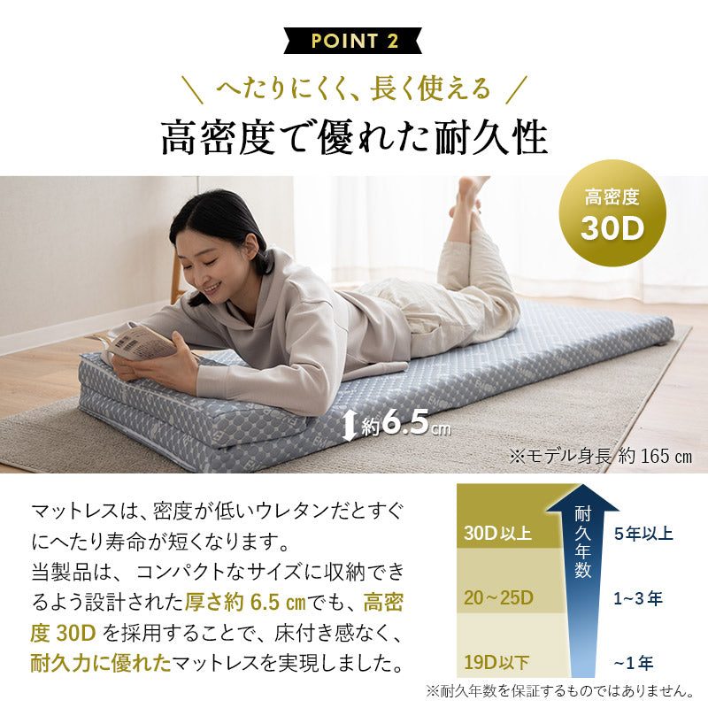 厚さ約6.5cmの高密度30Dウレタンを採用し、床付き感なく優れた耐久性と体圧分散性を両立しました。