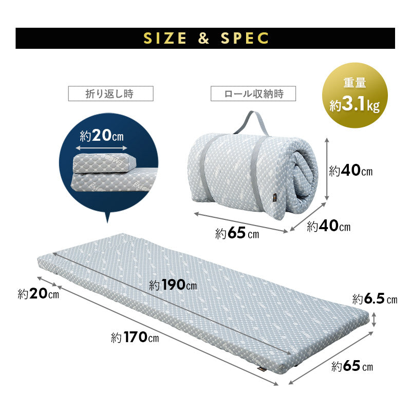 | サイズ | スリムサイズ:約幅65×奥行190×厚さ6.5cm 折り返し時:約幅65×奥行170×厚さ6.5cm ロール収納時:約幅65×奥行40×高さ40cm |
