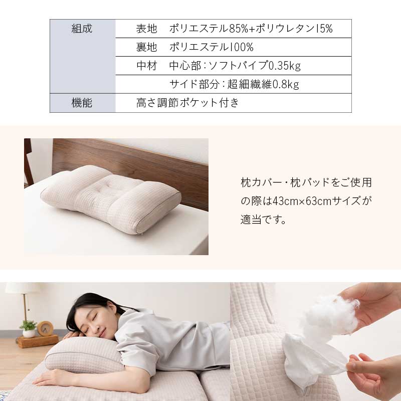 中央部にはしっかり支えるパイプ素材、サイドには耳当たりの良いマイクロファイバーを使用しています。