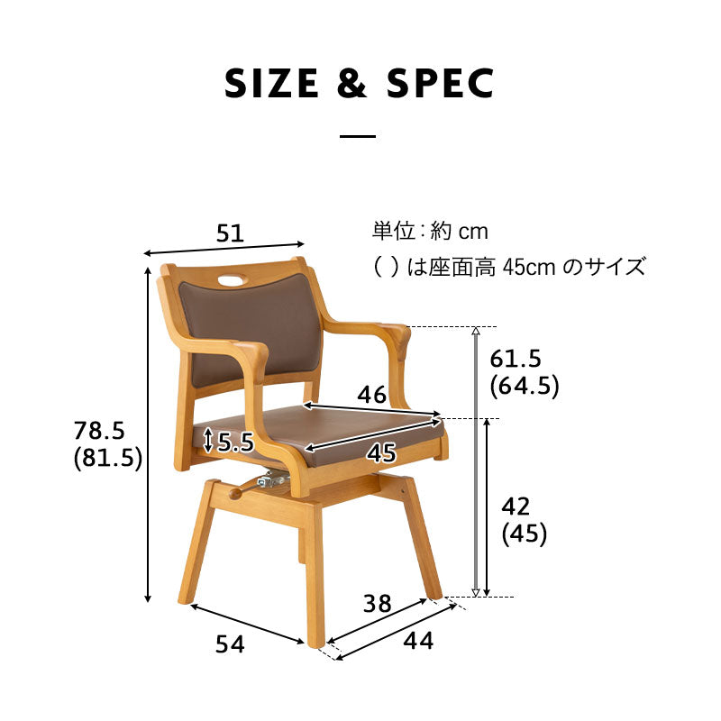 | サイズ | ■座面高42cm 全体:約幅51×奥行54×高さ78.5cm 座面:約幅45×奥行46×高さ42cm ■座面高45cm 全体:約幅51×奥行54×高さ81.5cm 座面:約幅45×奥行46×高さ45cm |