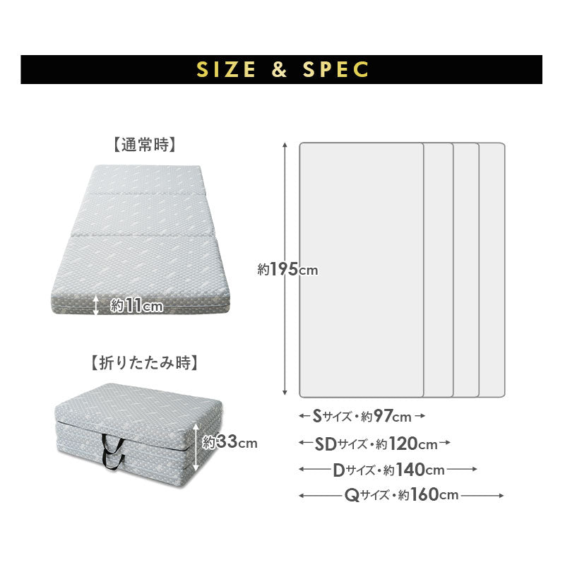 | サイズ | クイーンサイズ:約幅160×奥行195×高さ11cm (折りたたみ時:高さ約33cm) |