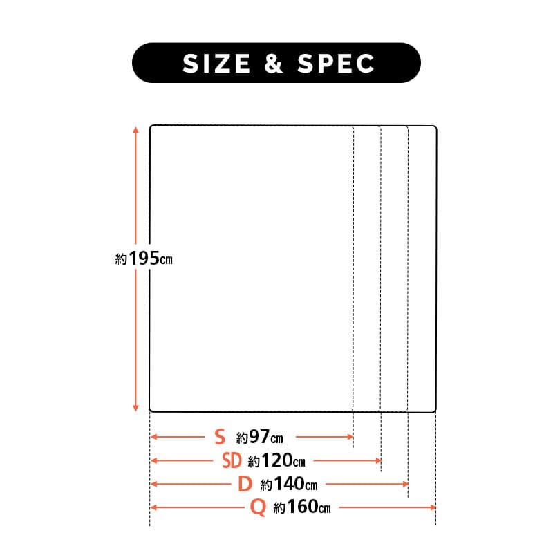 シングルサイズ:約幅97×奥行195×厚さ10cm セミダブルサイズ:約幅120×奥行195×厚さ10cm ダブルサイズ:約幅140×奥行195×厚さ10cm クイーンサイズ:約幅160×奥行195×厚さ10cm |