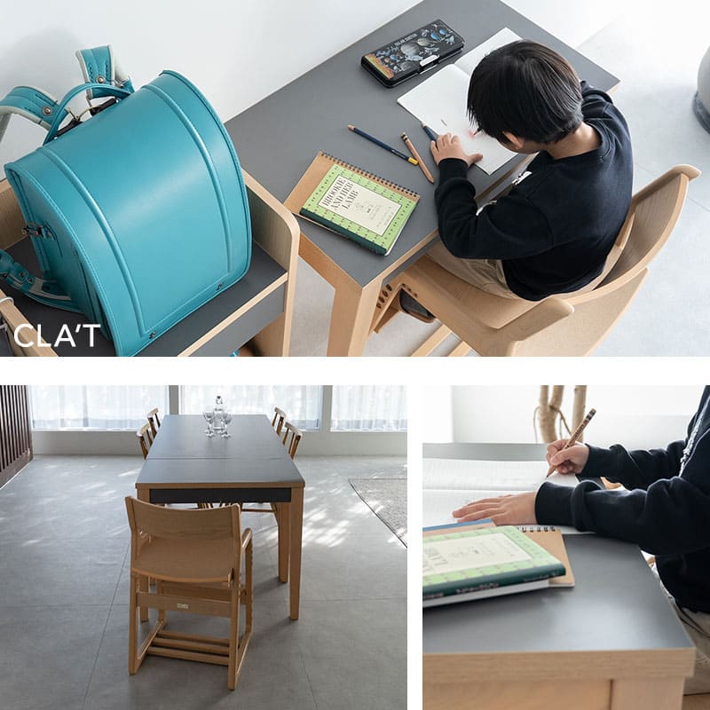 耐久性の高いニレ無垢材とメラミン天板を使用し、学習やお絵描き、食事にも気兼ねなく使えます。