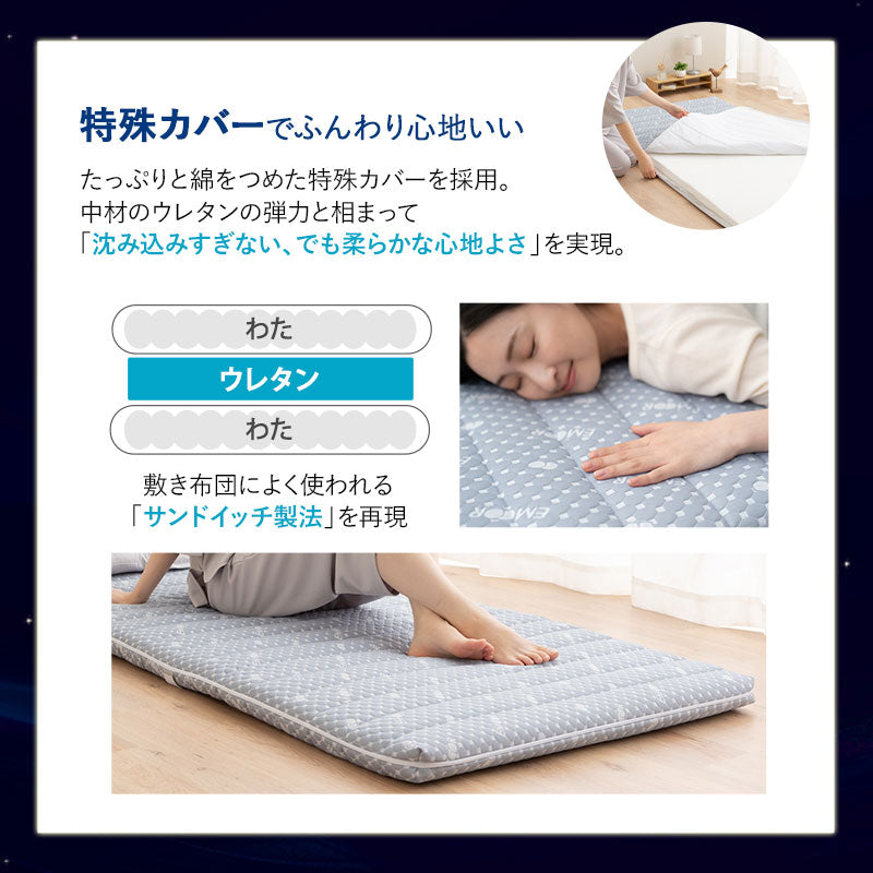 独自の綿入り特殊カバーとウレタンの組み合わせで、沈み込みすぎず柔らかな寝心地を提供します。