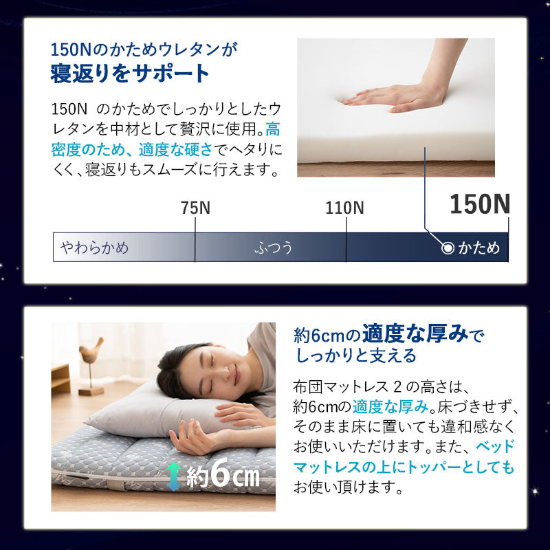厚さ約6cm・高密度150Nの硬めウレタンが体をしっかり支え、寝返りも快適にサポートします。