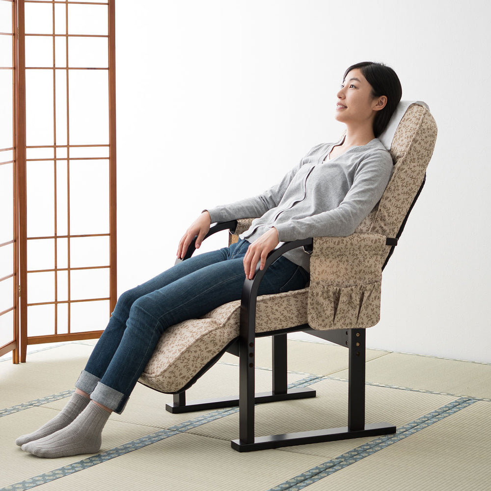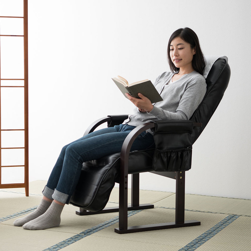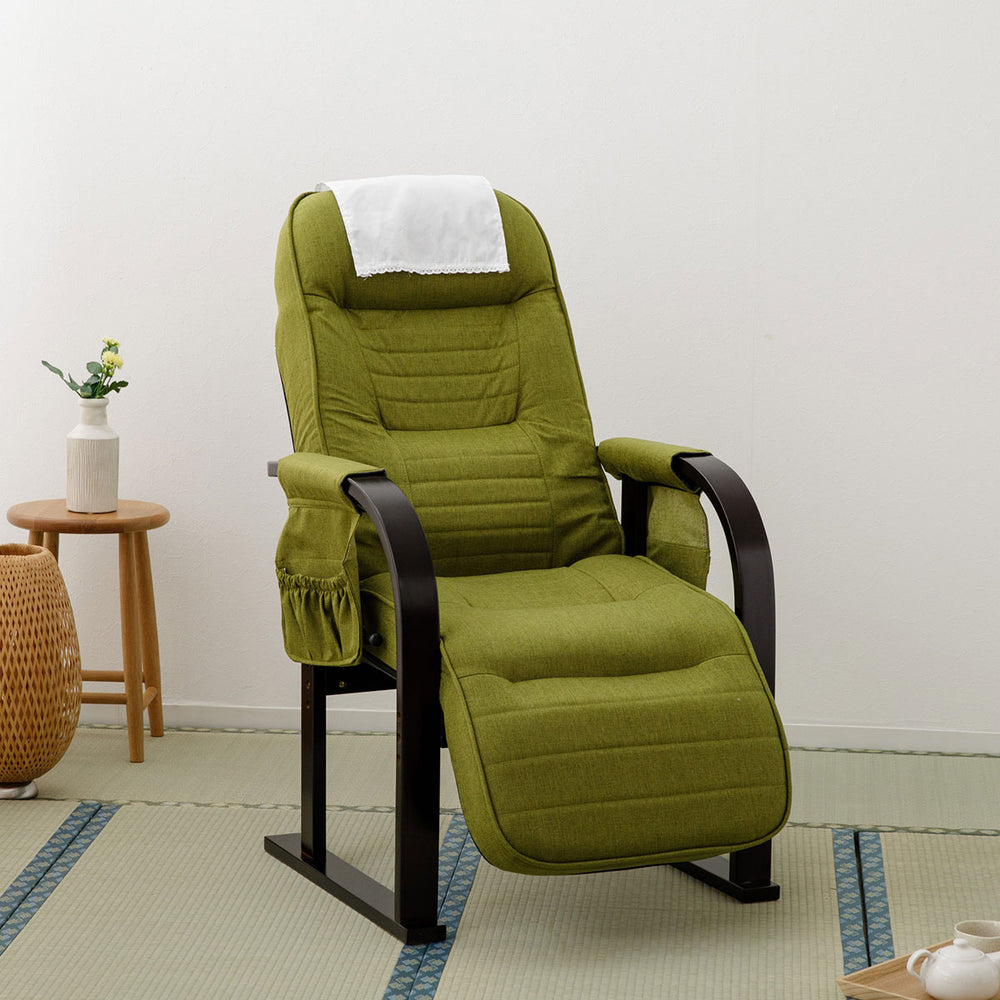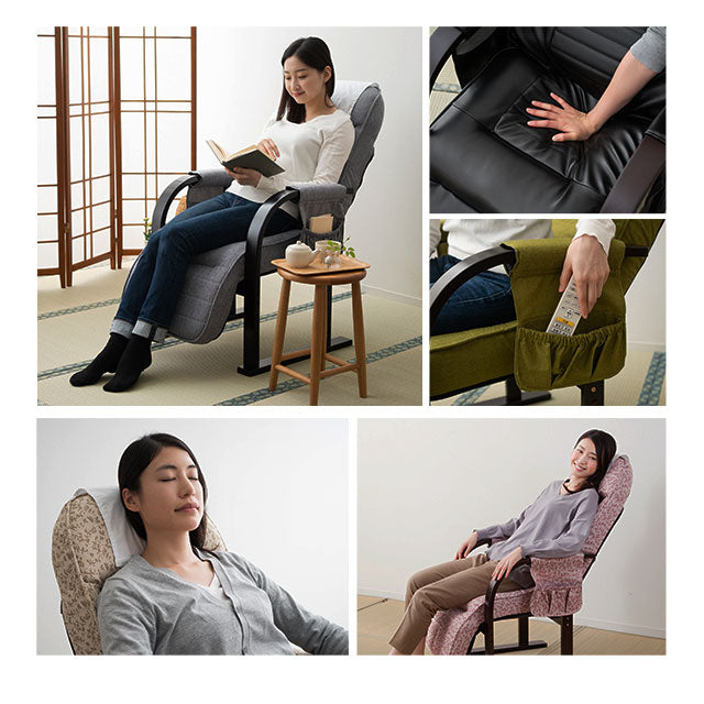 木肘ポケットや着脱カバー、幅広の木製肘で収納性・清潔さ・立ち上がりのサポートを実現します。