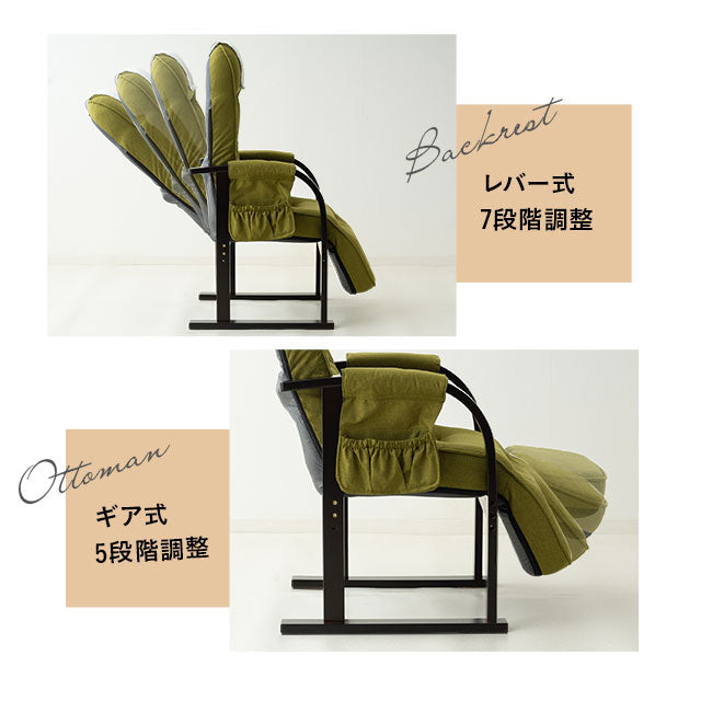 背もたれ7段階・オットマン5段階リクライニング、座面高2段階調節で快適な座り心地です。