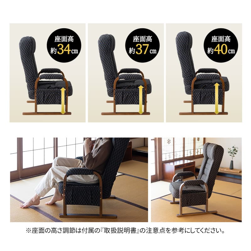 座面高はご自宅で34cm・37cm・40cmに調節可能で、体型や好みに合わせて簡単に高さ調節が可能です。